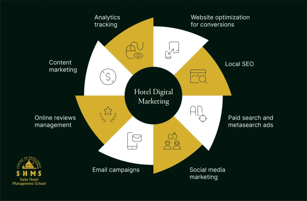 กลยุทธ์การตลาดดิจิทัลที่ดีคือการผสมผสานทุกช่องทางให้ทำงานร่วมกัน — ตั้งแต่เว็บไซต์ โซเชียลมีเดีย SEO โฆษณา รีวิว ไปจนถึงอีเมล — เพื่อพาผู้เข้าชมจากการ “ค้นพบ” ไปจนถึง “จองห้องพักจริง”